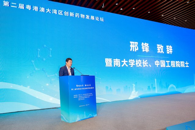 邢锋在第二届粤港澳大湾区创新药物发展论坛开幕式上致辞。他介绍了暨南大学的办学历史和成就,并表示,药学学科作为我校的“双一流”建设学科,多年来聚焦新药创制、中药现代化等核心领域,依托生物活性分子与成药性优化全国重点实验室等平台,集聚一流科研团队,在基础研究突破、关键技术攻关、成果转化落地等方面不断取得新进展。这次活动汇聚了国内顶尖专家学者,聚焦前沿领域,围绕创新药物高质量发展共谋创新路径。